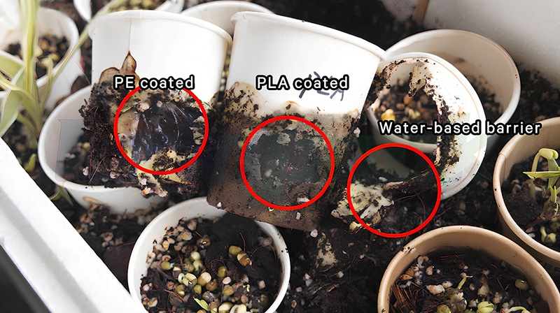245 nap elteltével a vizes bélelt papírpoharat teljesen lebontották, a PLA szálait lebontották, a PLA filmje megszakadt, és a PE film alapvetően érintetlen volt.